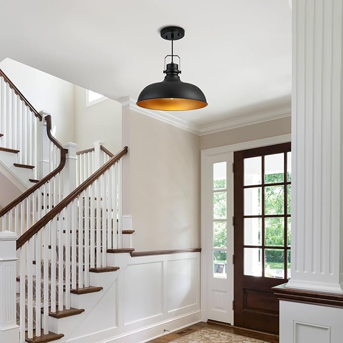 Black Farmhouse Pendant Lights 16 Inch Matte Pendant Lighting for Kitchen Island Industrial Adjustable Height Vintage Dome Hanging Light Fixtures for Barn, Dining Room 1 Pack