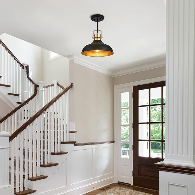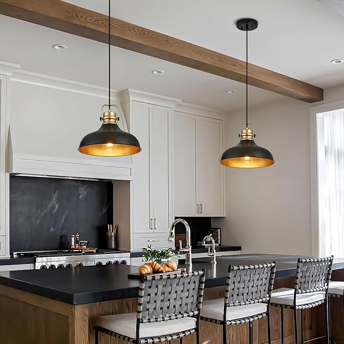 Black and Gold Farmhouse Pendant Lights Matte Pendant Lighting for Kitchen Island Industrial Adjustable Height Vintage Dome Hanging Light Fixtures for Barn, Dining Room 2 Packs