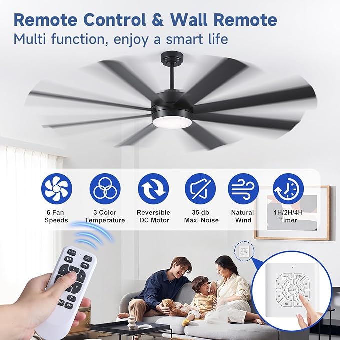 • Ceiling Fans with Lights and Remote: Simplify with the included multi-function remote control. Easily adjust the fan and led light settings to your preference, you can adjust wind speeds in 6 gears,select the ideal fan speed, and even set a timer(1/2/4H). Add an additional wall mounted remote control for extra protection.