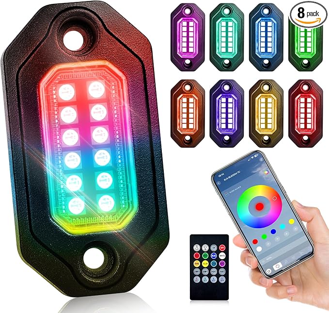 RGB LED Rock Lights Kit, 8 pods Multicolor Neon Light with Bluetooth App/Remote Control Flashing Music Mode, Aluminum Metal, IP68 Waterproof, 12v for Truck ATV UTV SUV