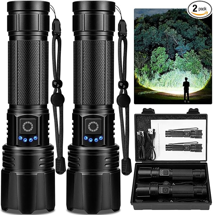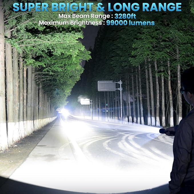 • [Looking for a super bright flashlight?]: Try our 2 pack 99,000 lumens brightest Flashlight.This Rechargeable flashlights high Lumens powerful flash lights up to 30 times brighter than ordinary LED flashlight.The Super Bright Flashlights can clearly illuminate things within 3280 feet (1000m) on a dark night, easily lighting up an entire room or backyard.