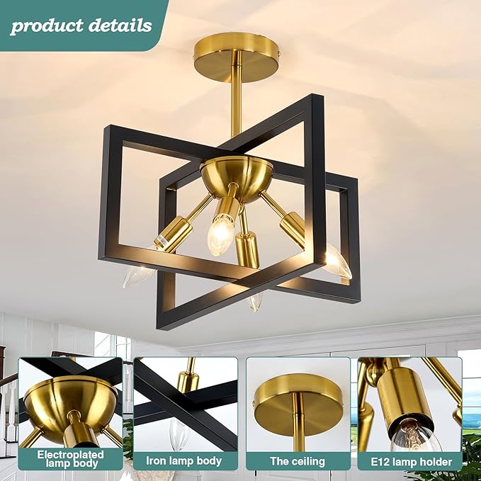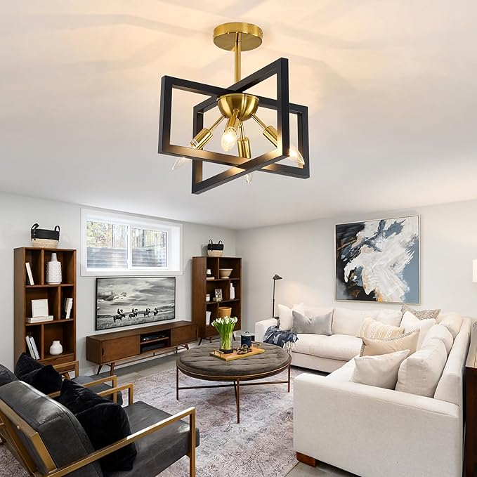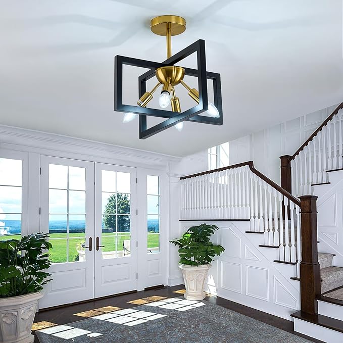ZGLAOJT 4-Lights Ceiling Light Fixture Modern Black and Gold Semi Flush Mount Ceiling Lighting Matte Chandelier for Bedroom Kitchen Foyer Hallway Living Room Farmhouse
