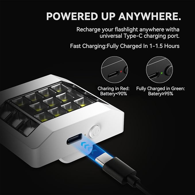 • Rechargeable: This clip on flashlight has 400mAh Lithium Battery for extended use: 2.5 hours on high light, 14 hours on low light, 12 hours in SOS mode, 6 hours on red safety light, 12 hours on flashing red light, 24 hours on flashing red/blue light. Features a Type-C port for fast charging. Charging time: 1-1.5 hours.