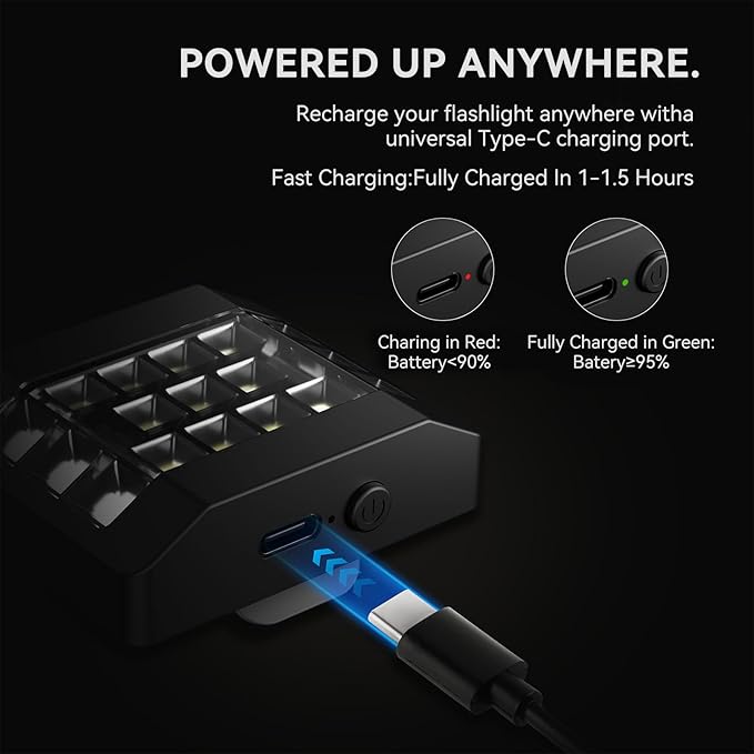 • Rechargeable: This clip on flashlight has 400mAh Lithium Battery for extended use: 2.5 hours on high light, 14 hours on low light, 12 hours in SOS mode, 6 hours on red safety light, 12 hours on flashing red light, 24 hours on flashing red/blue light. Features a Type-C port for fast charging. Charging time: 1-1.5 hours.