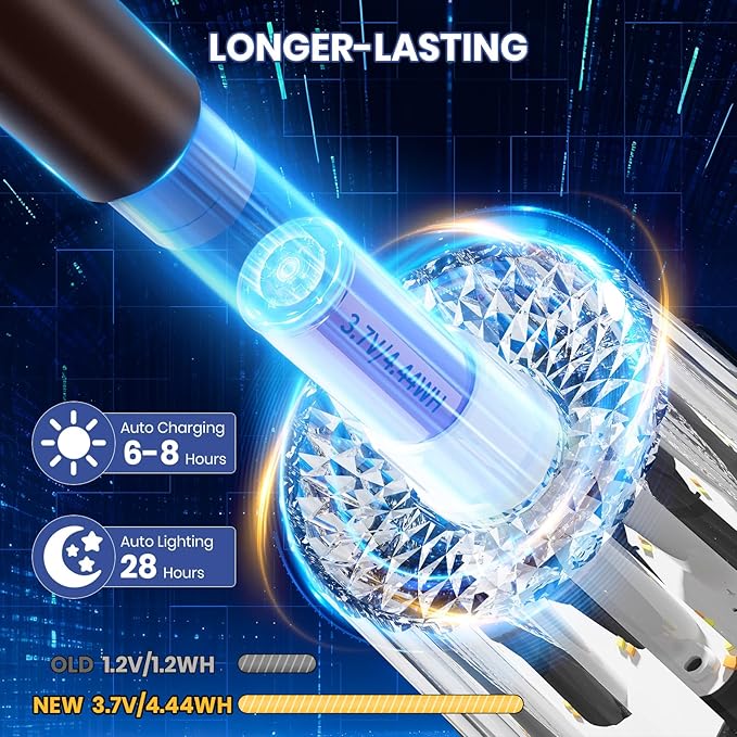 • 【Upgraded 1200mAh Battery & Long Lasting lighting】 Unlike ordinary ni-mh batteries, we use more reliable and larger capacity 4.44Wh 1200mAh Lithium-ion battery. The solar panels convert sunlight into electricity and store it in the battery during the day, and the led lights automatically illuminate at night. Our upgraded outdoor pathway lights solar powered only need to be exposed to sunlight for 6-8 hours to provide up to 28 hours of bright lighting time.