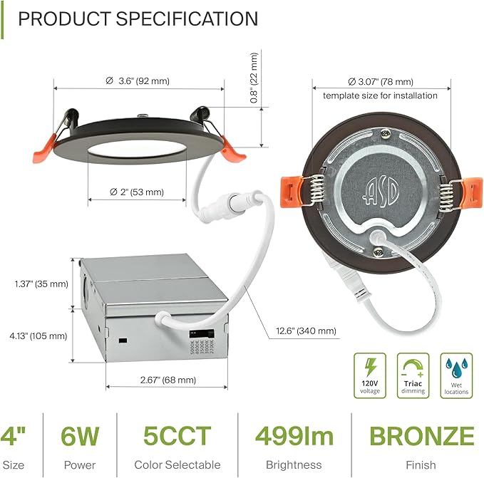 • 💡【5 Color Temperature】- ASD bronze trim 3 inch recessed LED lights have five colors to choose from: 2700K, 3000K, 3500K, 4000K, 5000K. You can select the desired color with a simple switch on the side of the junction box