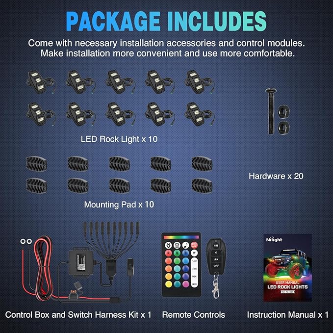 • Included Components : 1 X 4 Way Splitter Controller Harness Kit, 1 X User Manual, 10 X RGBW LED Rock Lights, 10 X Rubber Pads and Rust Proof Hardware, 2 X Remote Controller 1 X 4 Way Splitter Controller Harness Kit, 1 X User Manual, 10 X RGBW LED Rock Lights, 10 X Rubber Pads and Rust Proof Hardware, 2 X Remote Controller