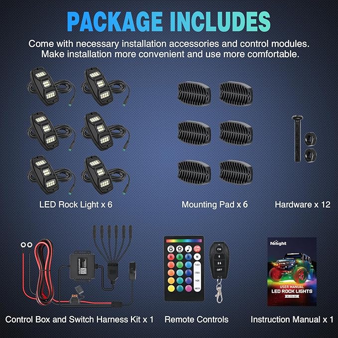 • Included Components : 1 X 4 Way Splitter Controller Harness Kit, 1 X User Manual, 2 X Remote Controller, 6 X RGBW LED Rock Lights, 6 X Rubber Pads and Rust Proof Hardware 1 X 4 Way Splitter Controller Harness Kit, 1 X User Manual, 2 X Remote Controller, 6 X RGBW LED Rock Lights, 6 X Rubber Pads and Rust Proof Hardware
