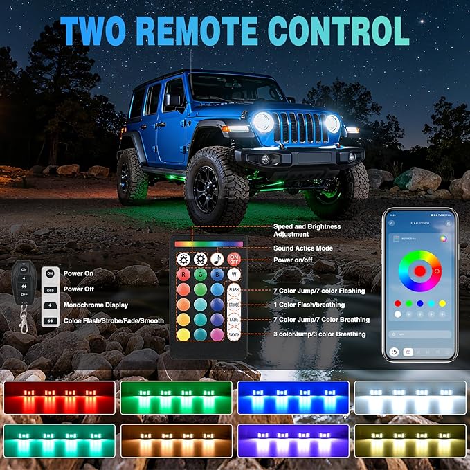 • 【Upgraded Lighting and Wide Angle】22 upgraded 5050+2835 SMD LEDs deliver brighter, longer lasting light. 210° wide angle covers more area, with 16 million colors, 29 dynamic modes (monochrome/jump/flash/breathing), and 6 scene modes (party/leisure/quiet, etc.). Customize speed, brightness, and strobe for personalized off-road vibes