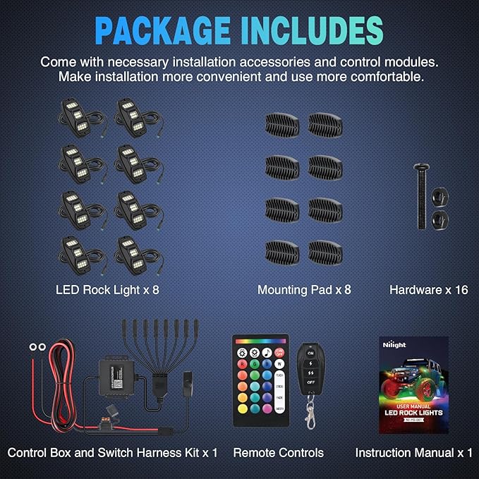 • Included Components : 1 X 4 Way Splitter Controller Harness Kit, 1 X User Manual, 2 X Remote Controller, 8 X RGBW LED Rock Lights, 8 X Rubber Pads and Rust Proof Hardware 1 X 4 Way Splitter Controller Harness Kit, 1 X User Manual, 2 X Remote Controller, 8 X RGBW LED Rock Lights, 8 X Rubber Pads and Rust Proof Hardware