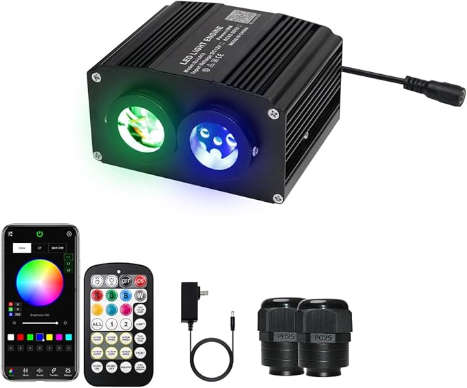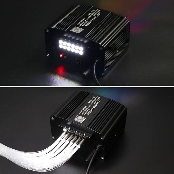 • 【Dual Color Starlight Box】: 2 in 1 design DUAL COLOR port version twinkle 18W fiber optic light box with 12LED pure white meteor,one side is two 20mm diameter light ports to make twinkle stars,colors can be independently control between two led port,another side is 12LED meteor port(5mm per), control by remote and APP via Bluetooth