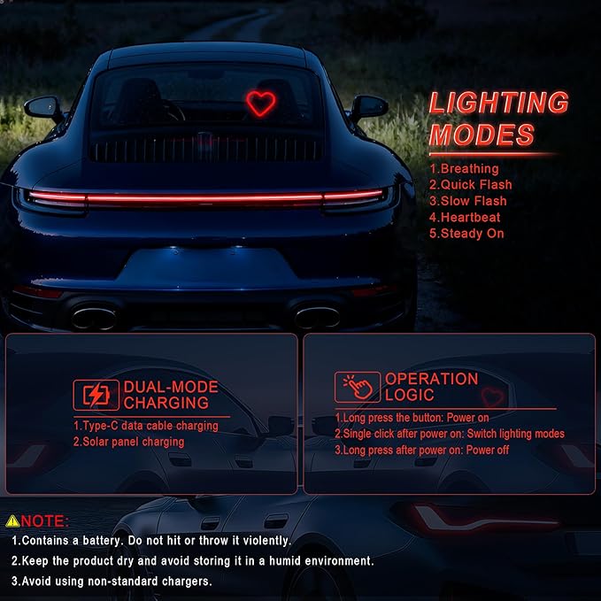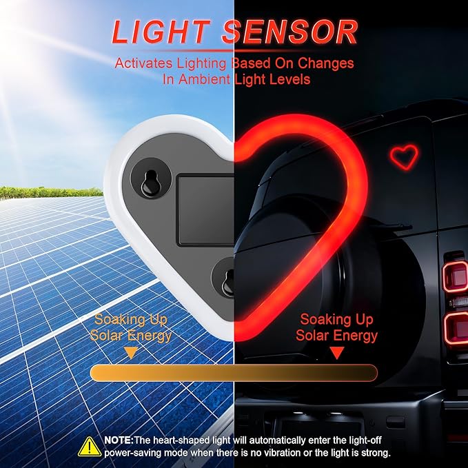 • Operation Logic: This heart- shaped ambient light supports the switching of multiple lighting modes, has a built- in vibration sensor and light sensor, and the illumination is triggered by these two sensors.The lighting is controlled by buttons.By long pressing the button, you can power on or off. After power on, single click to switch the lighting mode. It supports two charging methods: TYPE-C and solar charging.