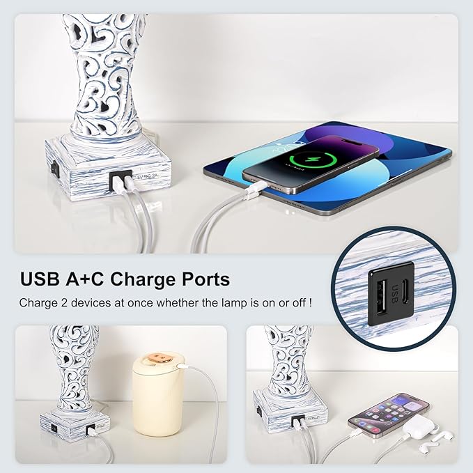 • USB A+C Charging Ports: Equipped with dual USB ports, this bedside table lamp lets you charge your phone, tablet, or other small electronic devices simultaneously. It can charge even when the light is off, making it convenient for you and your family.
