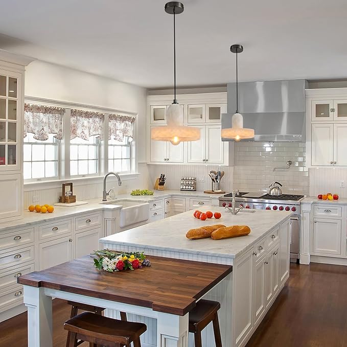 Alabaster Pendant Light Kitchen Island, Black Hanging Light Fixture with Natural Alabaster Stone Shade, Adjustable Pendant Lighting Over Sink, Dining, Bar, Counter - 2 Pack