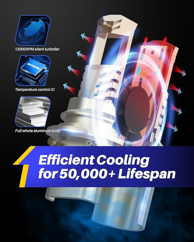 • Stable Performance and Longer Lifespan: Built-in 12,000RPM high-speed silent cooling fan. Combined with copper base and unique hollow design on all-in-one aluminum body. Which help to dissipate the heat generated from the L E D chips rapidly and effectively. Ensure the hb5 light bulb work steadily and continuously more than 50,000 hours