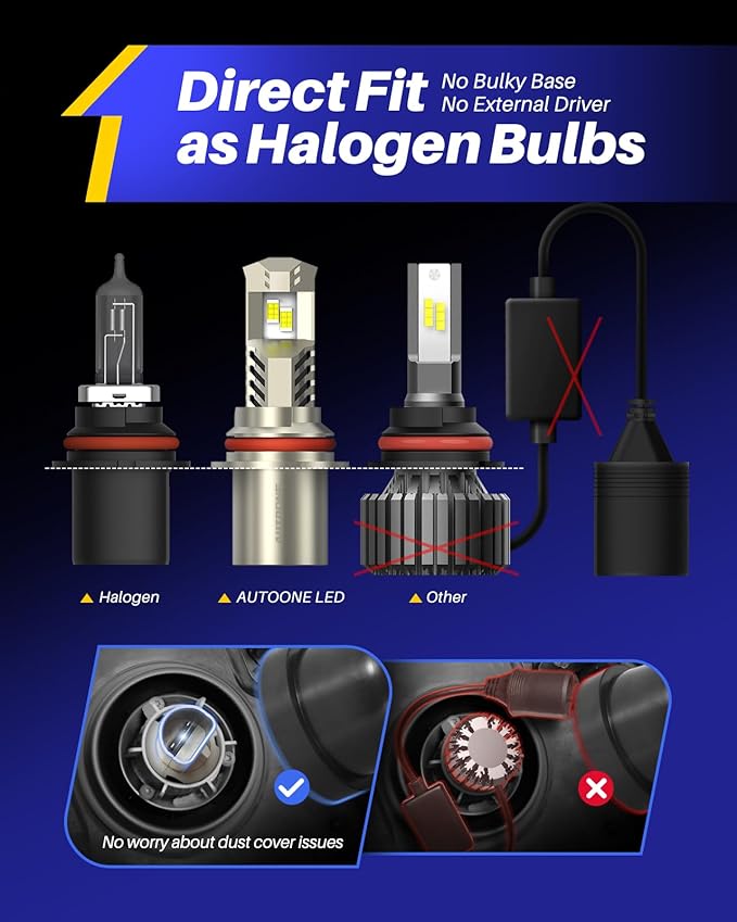• Plug and Play Installation: AUTOONE hb5/9007 led bulbs feature a plug-and-play wireless and 1:1 ha logens’ size design that allows people to get rid of bulky drivers and annoying wiring harnesses. No modifications on the enclosure or housing, 5 minutes easy installation
