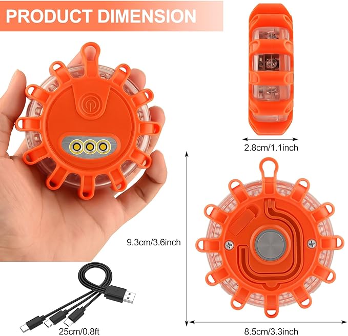 Widely Used -- This 3 Pack usb c rechargeable LED road lighting emergency lights is suitable for outdoor activities such as camping, hiking, boating, cycling, etc. It can also be used for cars, trucks, ships, RVs, marines, motorcycles, surface buoys and marine salvage, broken-down vehicle traffic warnings, rescue operation signs, major vehicle transportation warnings and other emergencies.