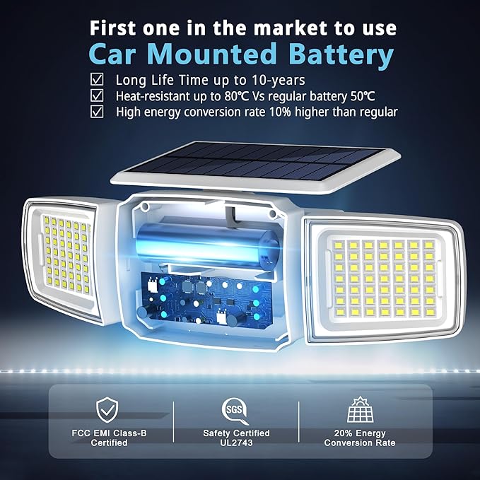 • ✨【Upgraded Motion sensor】Solar Security Lights with latest car used Motion Senor technology detects up to 270° wide angle and 430 sq·ft sensing distance, which can provide extra brightness and more visible area