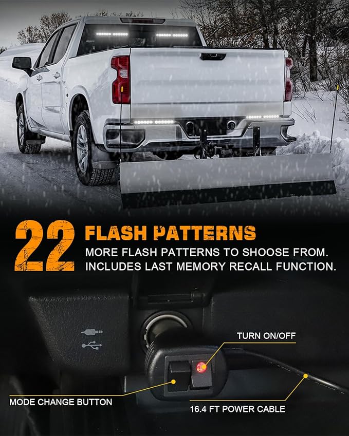 • 【QUICK REPONSE】With 12V cigarette lighter switch. The warning hazard lights have 22 flashing patterns to choose from for many different uses. Plug and play, quick response, saves the last strobe pattern you last used.