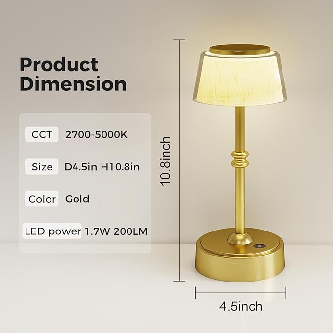 LED Cordless Lamp, 5 Colors Stepless Dimming Table Lamp, Built-in 4400mAh Rechargeable Battery with USB Charging Port, Portable Touch Bedside Light for Patio, Restaurant, Dining (1, Gold)